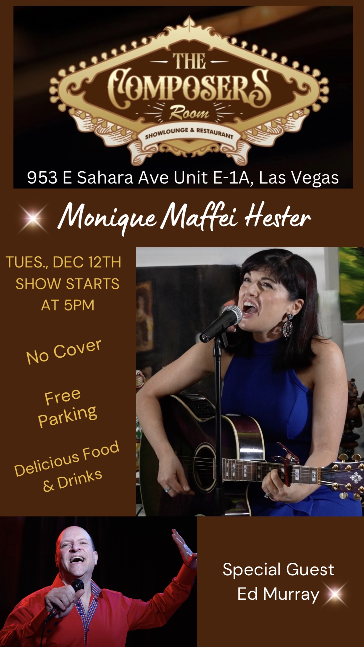 Tavern Stage @ The Composers Room 953 E SAHARA AVE, E1A, LAS VEGAS, NV, United StatesMonique Maffei Hester is a professional singer, songwriter, speaker, and empowerment coach. As a public speaker, she uniquely combines singing with speaking to convey positive messages and accessible tools for self-awareness and change. She is also the host and producer of an online post called “Tea Talk,” where she shares engaging content and everyday life-inspired teaching […]