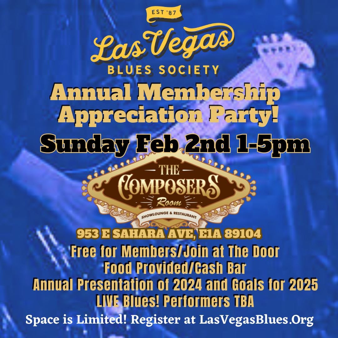 Showlounge Stage @ The Composers Room 953 E Sahara E1A, Las Vegas, NV, United StatesOur biggest all ages party of the year! Come hear President Jimmy Carpenter talk about last years successes and plans for the upcoming year! Meet our new Board members and enjoy complimentary food.. oh and of course, listen to some sweet sweet blues music Free for Members/Join at The Door Food Provided/Cash Bar Annual Presentation […]