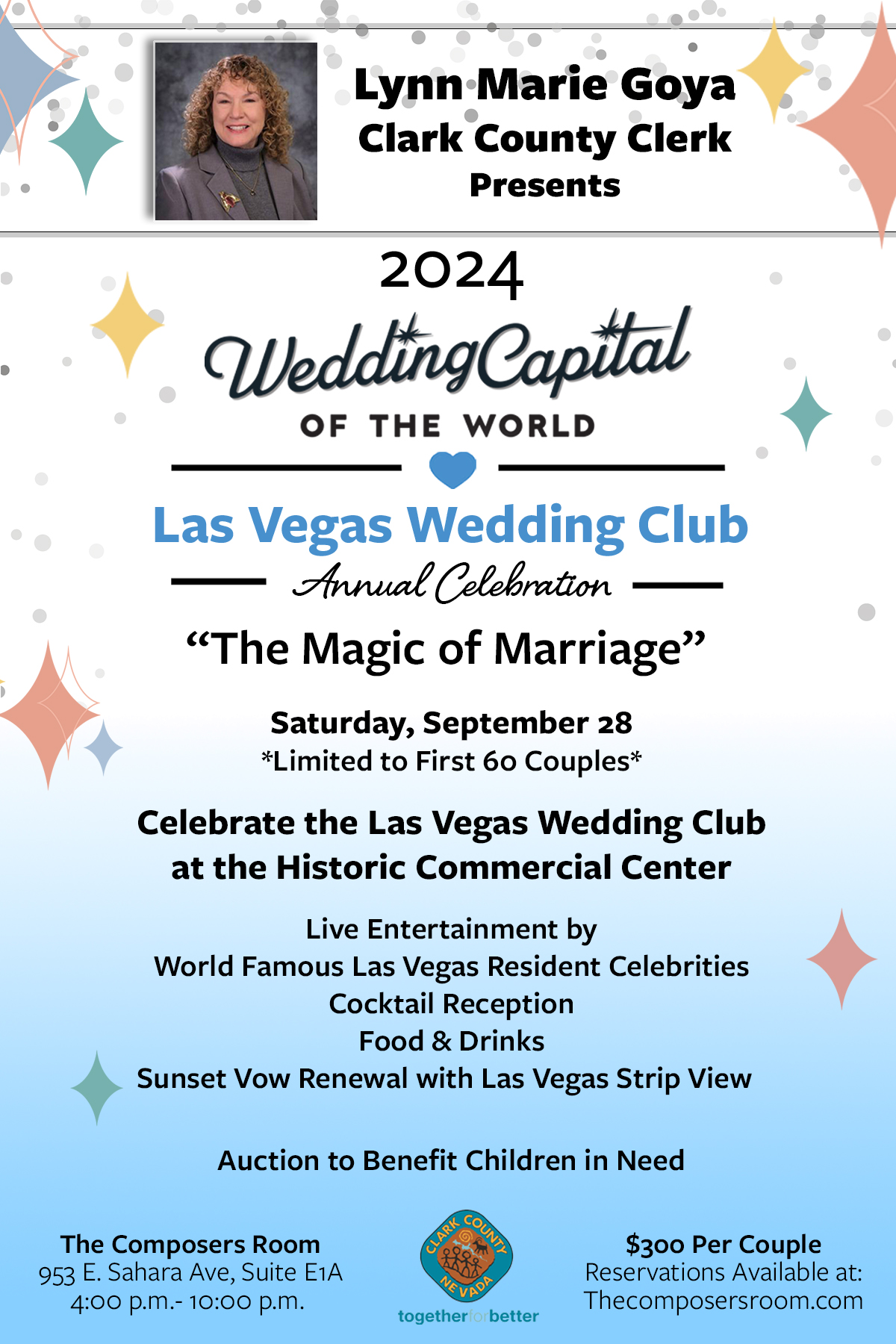 FeaturedShowlounge Stage @ The Composers Room 953 E Sahara E1A, Las Vegas, NV, United StatesCelebrate "The Magic of Marriage" with the Las Vegas Wedding Club Event: Las Vegas Wedding Club Annual Celebration Theme: "The Magic of Marriage" Presented by: Lynn Marie Goya, Clark County Clerk Date: Saturday, September 28 Time: 4:00 p.m. - 10:00 p.m. Venue: The Composers Room, 953 E. Sahara Ave, Suite E1A, Las Vegas Tickets: […]